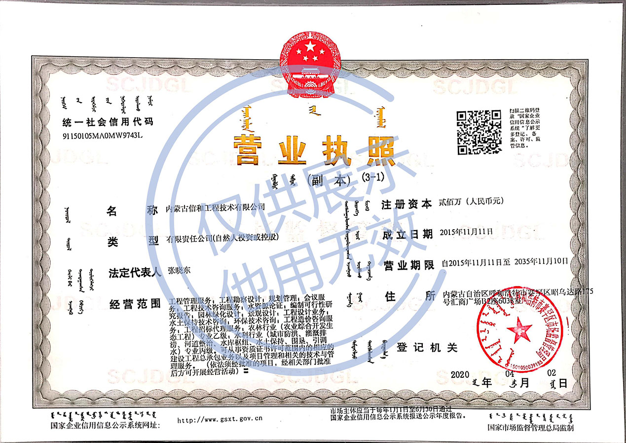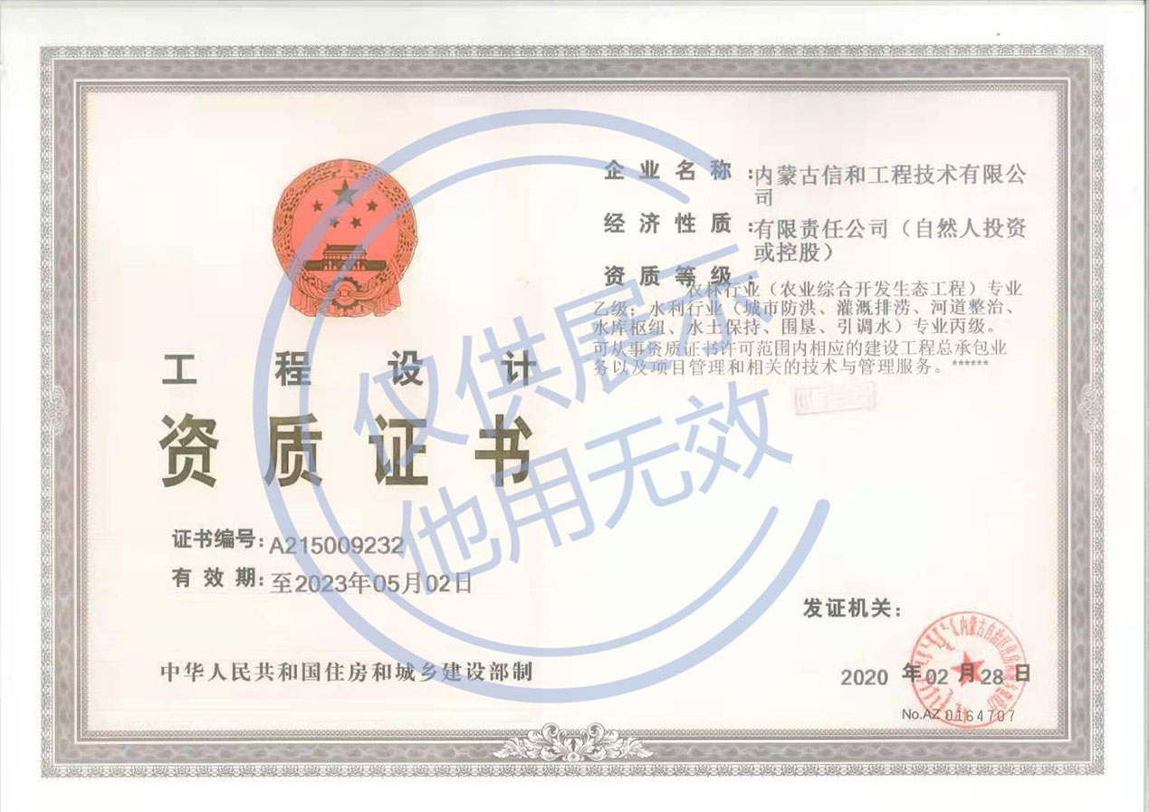 内蒙古信和工程技术有限公司成立于2015 年 11 月,注册资金 200 万元,是一家具有独立法人资格的有限责任公司。公司于2018 年9 月取得了内蒙古自治区住房和城乡建设厅颁发的水利行业(灌溉排涝、引调水、水库枢纽、河道整治、城市防洪、水土保持、围垦专业)专业丙级、农林行业(农业综合开发生态工程) 专业乙级( 证书编号: A215009232 ) 工程测量乙级( 证书编号B215009232)。公司现有专业技术人员 42名,其中具有高级职称 22 名,中级职称 20名。技术人员专业包括:水利水电,土木工程,水土保持,农业水利,工程测量,工程地质水文等相关专业。其中有本科学历技术人员 30 名,专科学历技术人员 12 名。公司专业技术人员均具有一定水准的技术实力和丰富的工作经验。