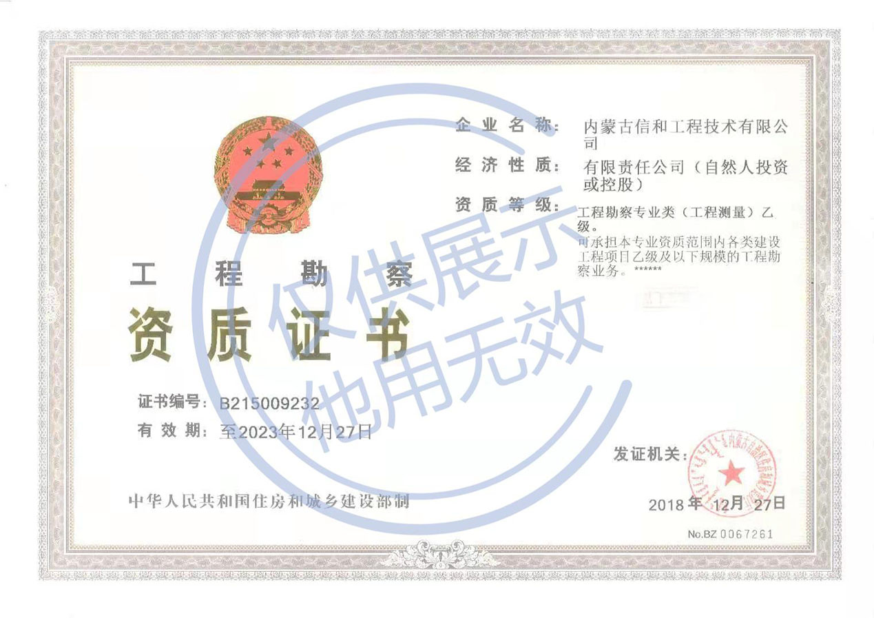 内蒙古信和工程技术有限公司成立于2015 年 11 月,注册资金 200 万元,是一家具有独立法人资格的有限责任公司。公司于2018 年9 月取得了内蒙古自治区住房和城乡建设厅颁发的水利行业(灌溉排涝、引调水、水库枢纽、河道整治、城市防洪、水土保持、围垦专业)专业丙级、农林行业(农业综合开发生态工程) 专业乙级( 证书编号: A215009232 ) 工程测量乙级( 证书编号B215009232)。公司现有专业技术人员 42名,其中具有高级职称 22 名,中级职称 20名。技术人员专业包括:水利水电,土木工程,水土保持,农业水利,工程测量,工程地质水文等相关专业。其中有本科学历技术人员 30 名,专科学历技术人员 12 名。公司专业技术人员均具有一定水准的技术实力和丰富的工作经验。
